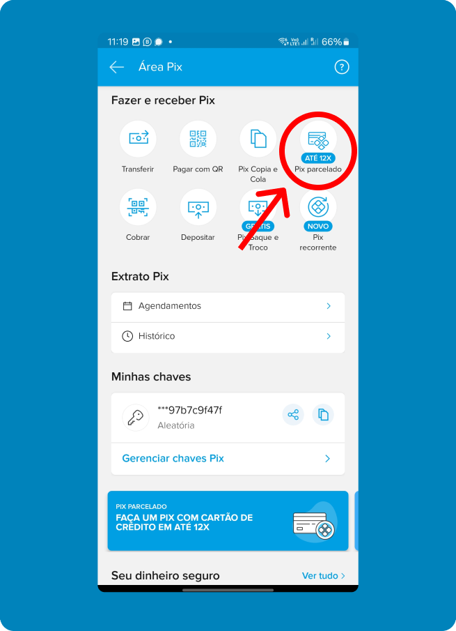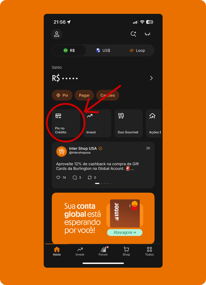 Abra seu aplicativo do Inter e selecione a opção "PIX no Crédito".