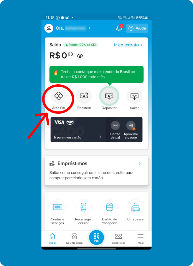 Abra seu aplicativo do Mercado Pago e selecione a opção "Área PIX".